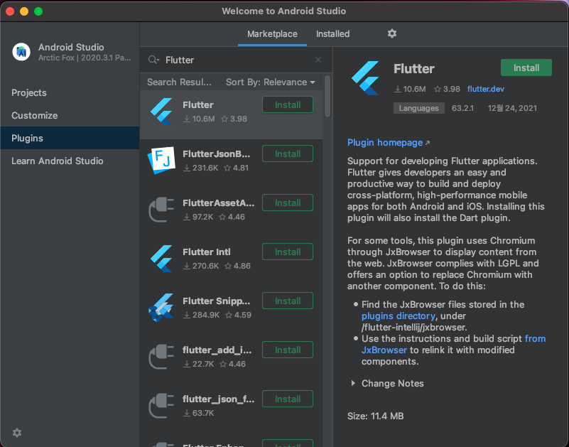 - Select the Flutter plugin and click Install.