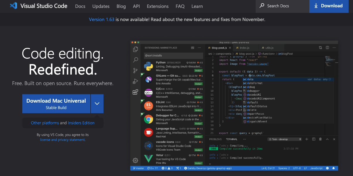 Visual Studio Code is a code editor redefined and optimized for building and debugging modern web and cloud applications. Visual Studio Code is free and available on your favorite platform - Linux, macOS, and Windows.