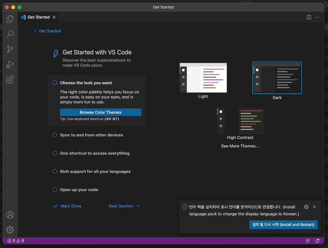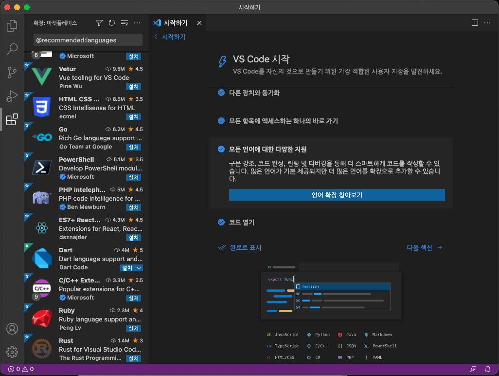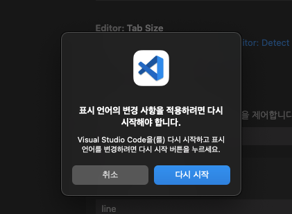VS Code가 자동으로 한글로 설정이 되어 있어 살짝 불편하네요.