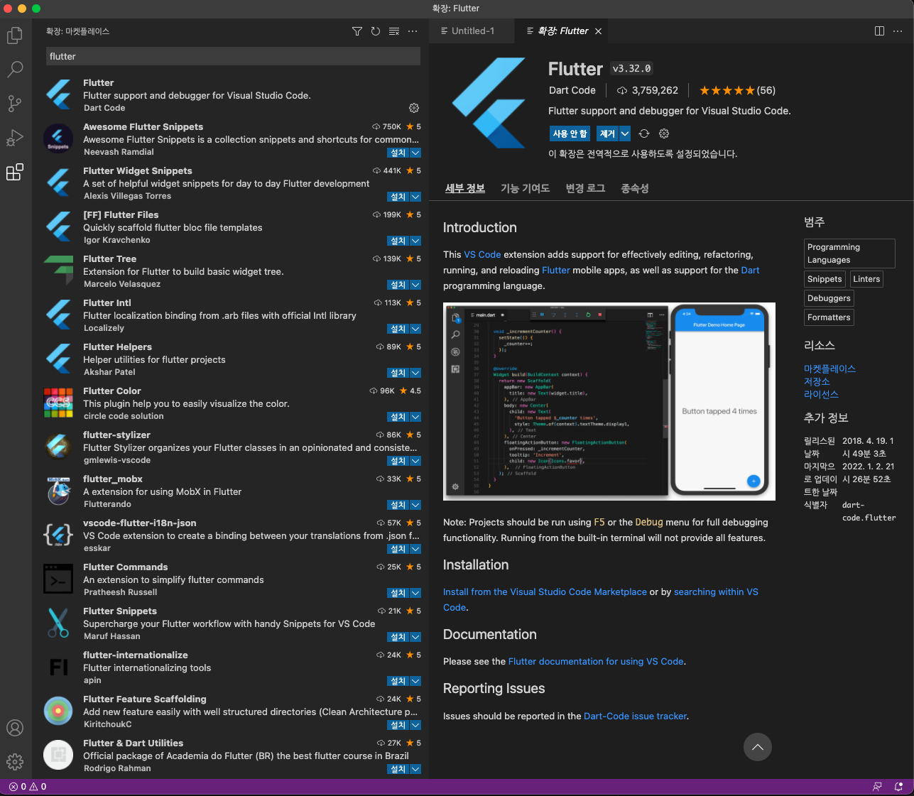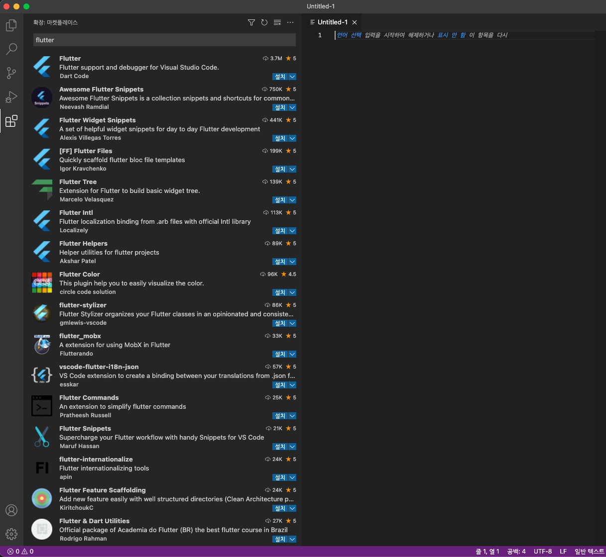 이제 플러터 설치는 VS Code에 완료 되었네요.